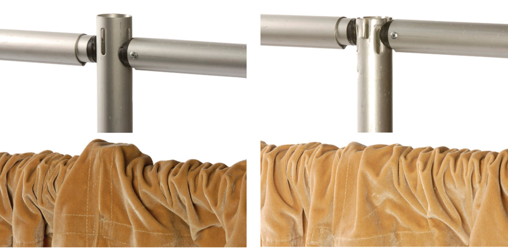 With pipe & base, curtains are most commonly sleeved over a telescopic drape horizontal by using a pocket sewn into the top of the drape panel. By increasing the linear length of drape over a fixed horizontal, fullness is created. This extra fabric gathered over the pipe creates the pleated look that is sought.