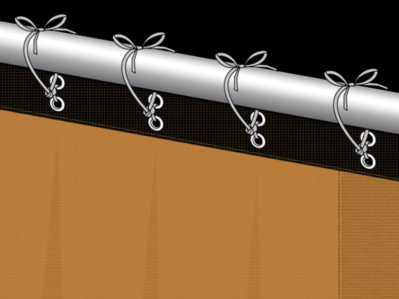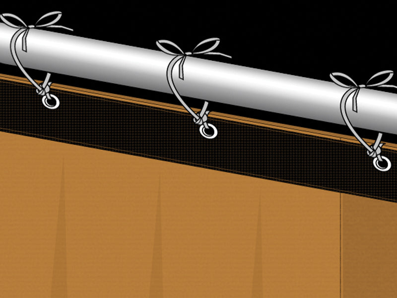 A simple, looping tie system where the drape is hung immediately below the pipe with the cord looped through two grommets in the top finish.
