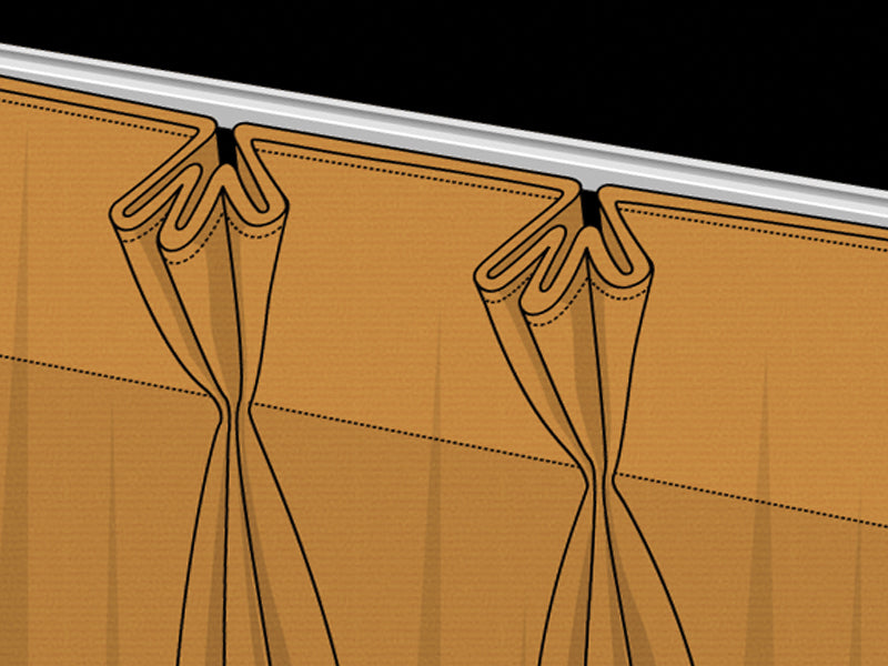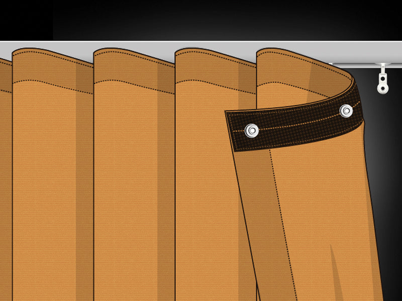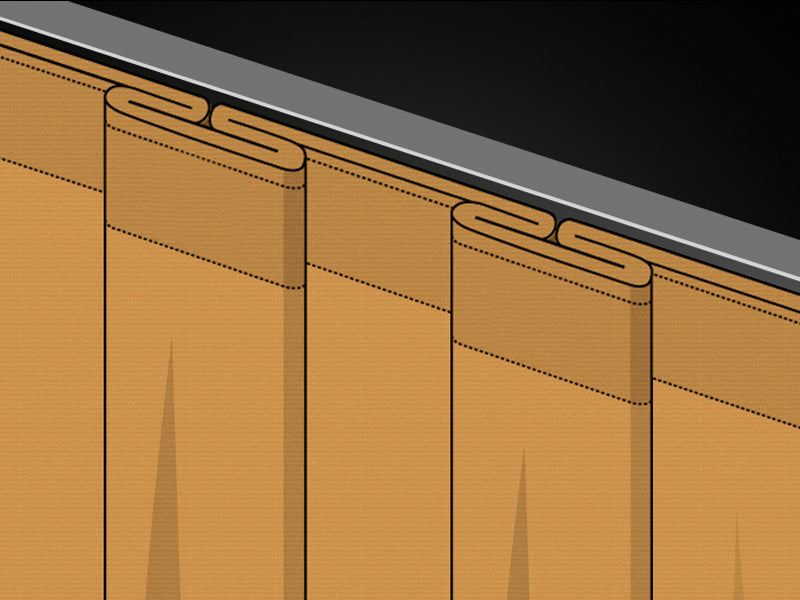 A flat drape with snaps in its top finish allowing for varying fullness. Recommended for lighter weight drapes.